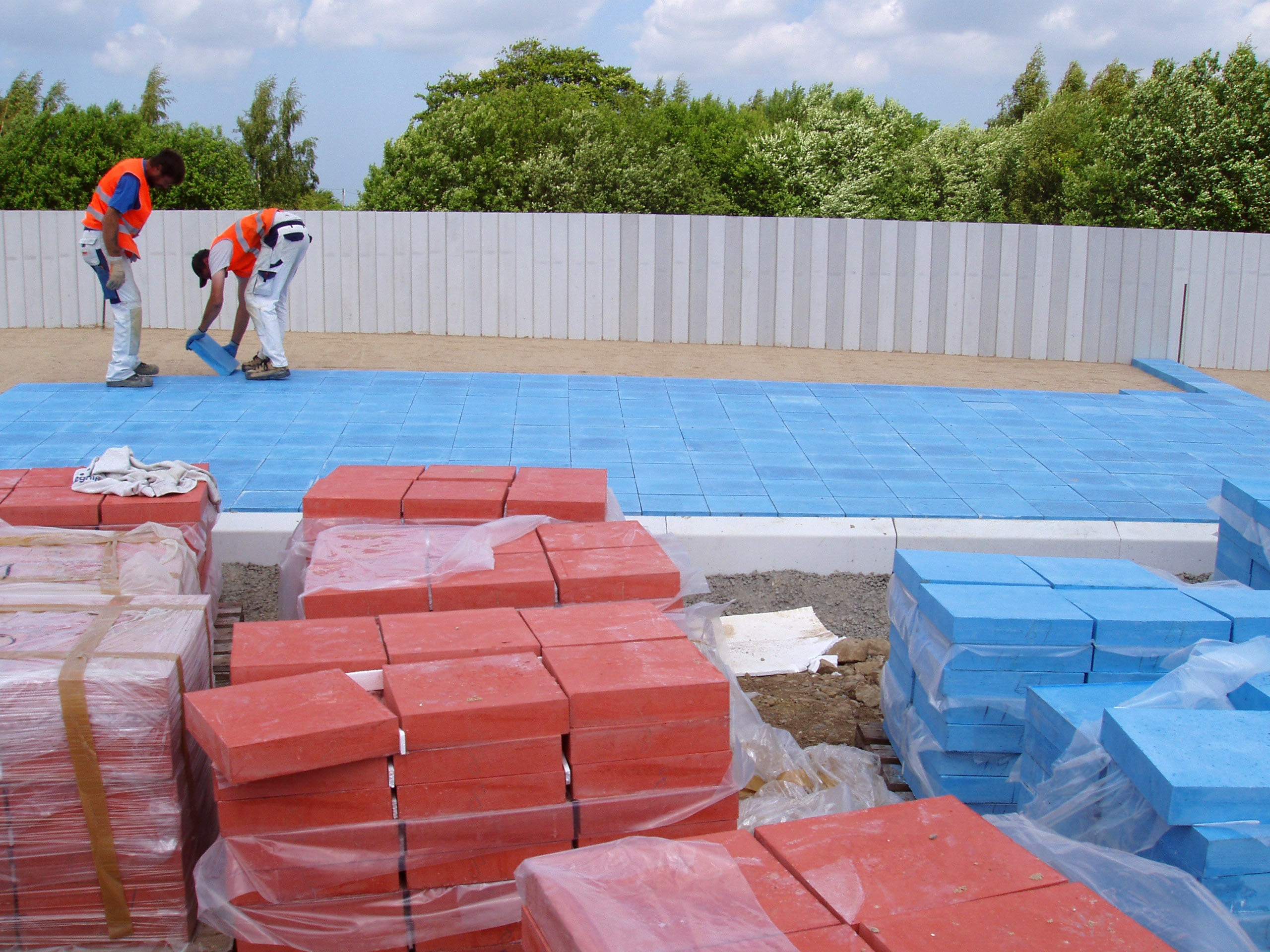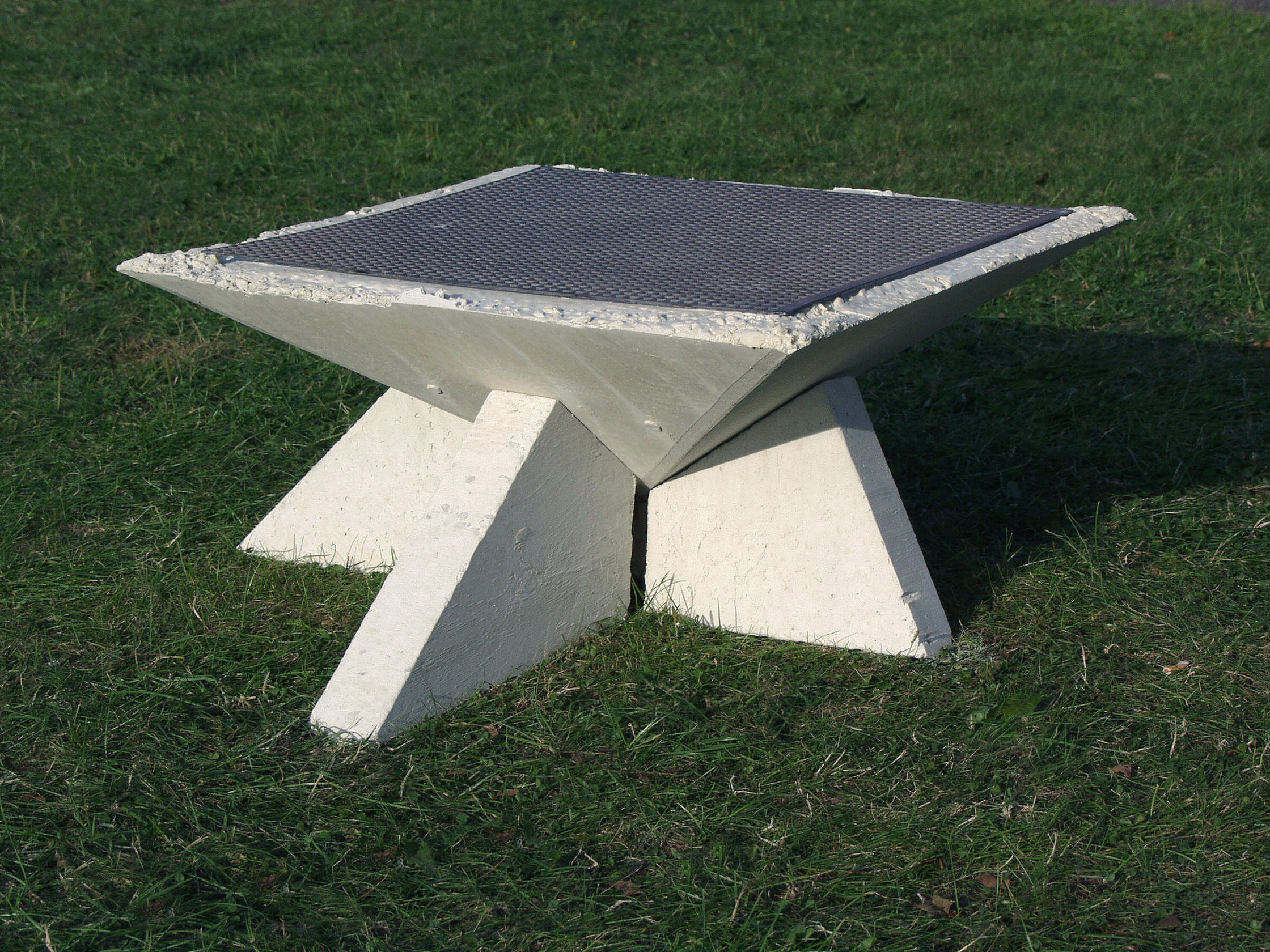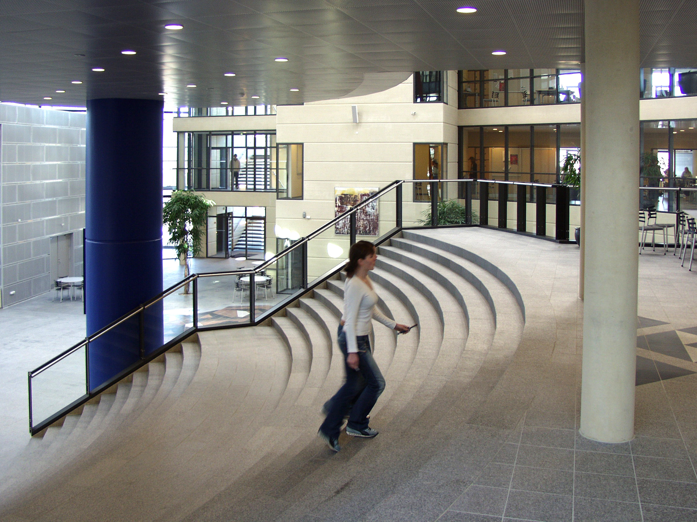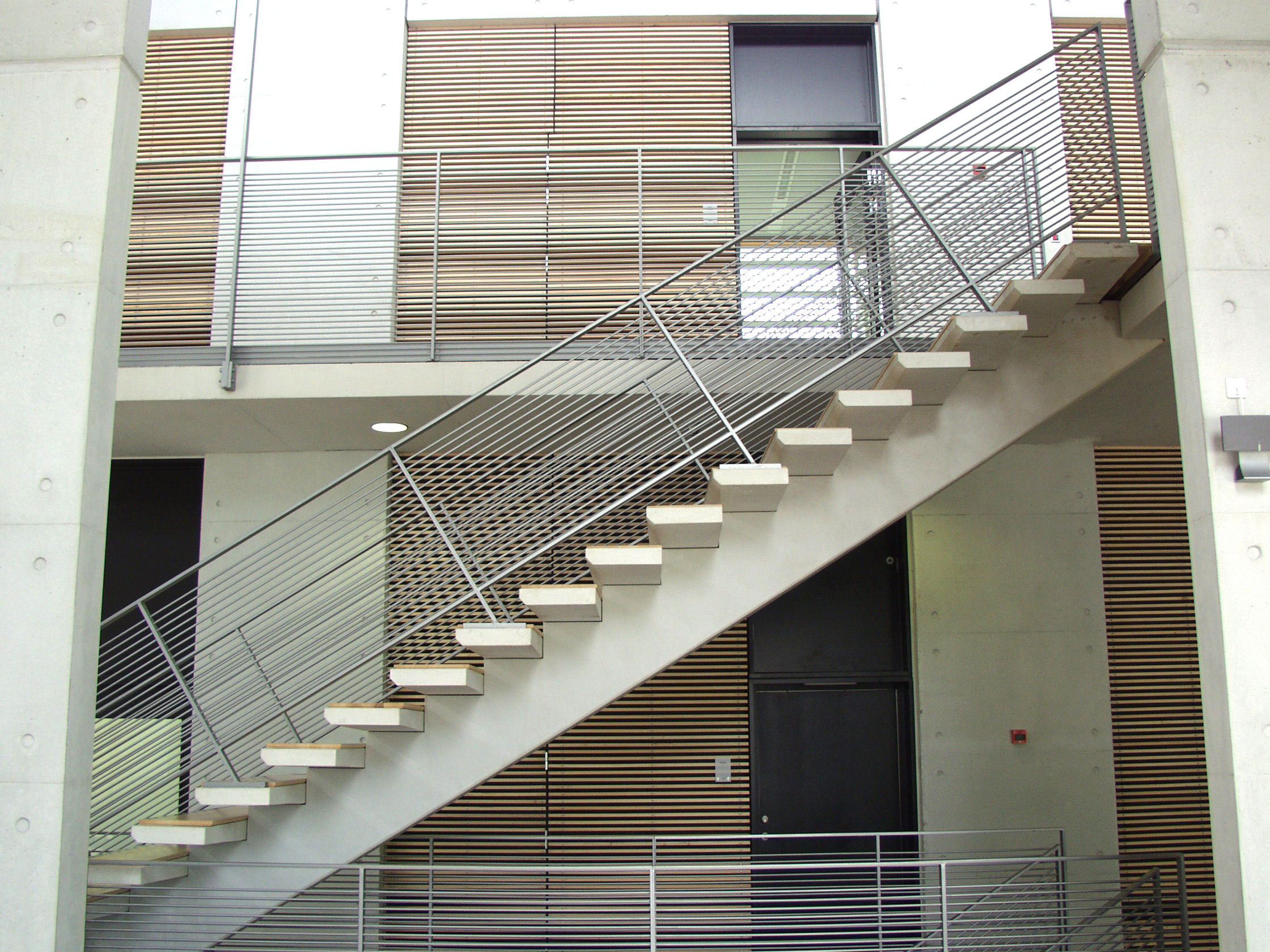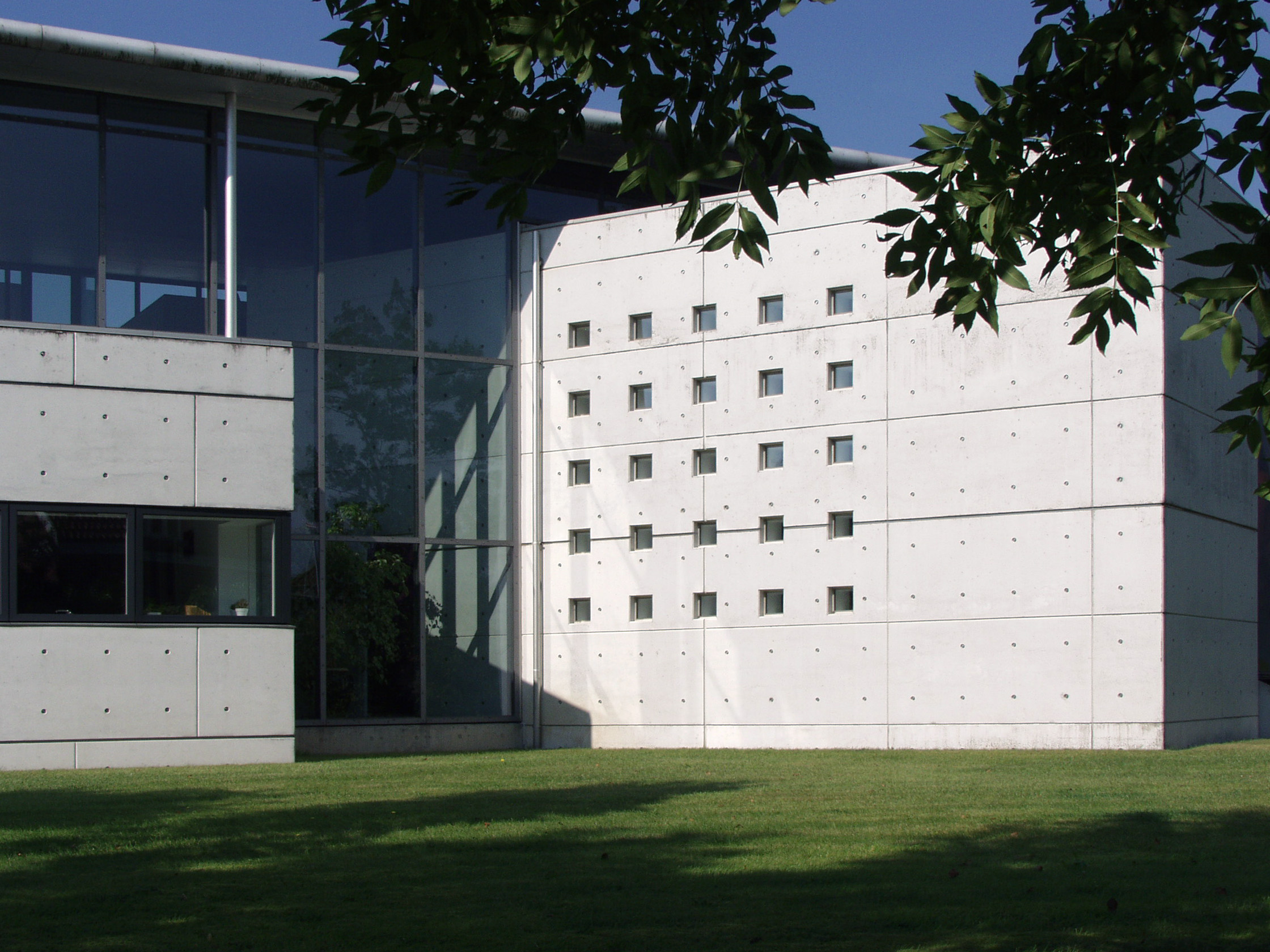 Les trois grandes colonnes de béton noir préfabriquées à l’entrée du bâtiment en sont un bon exemple. Ces colonnes, à la finition polie, glacée, sont en ciment AALBORG WHITE . C’est volontairement qu’elles n’atteignent pas tout à fait, ni ne soutiennent, le toit en forme d’aile.