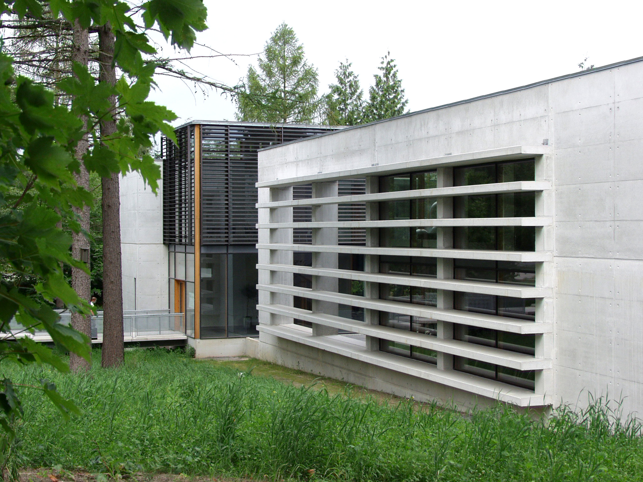 La façon dont les monolithes de béton blanc pénètrent le mur de verre renforce l’utilisation du verre comme une membrane pour briser la stricte distinction entre extérieur et intérieur.